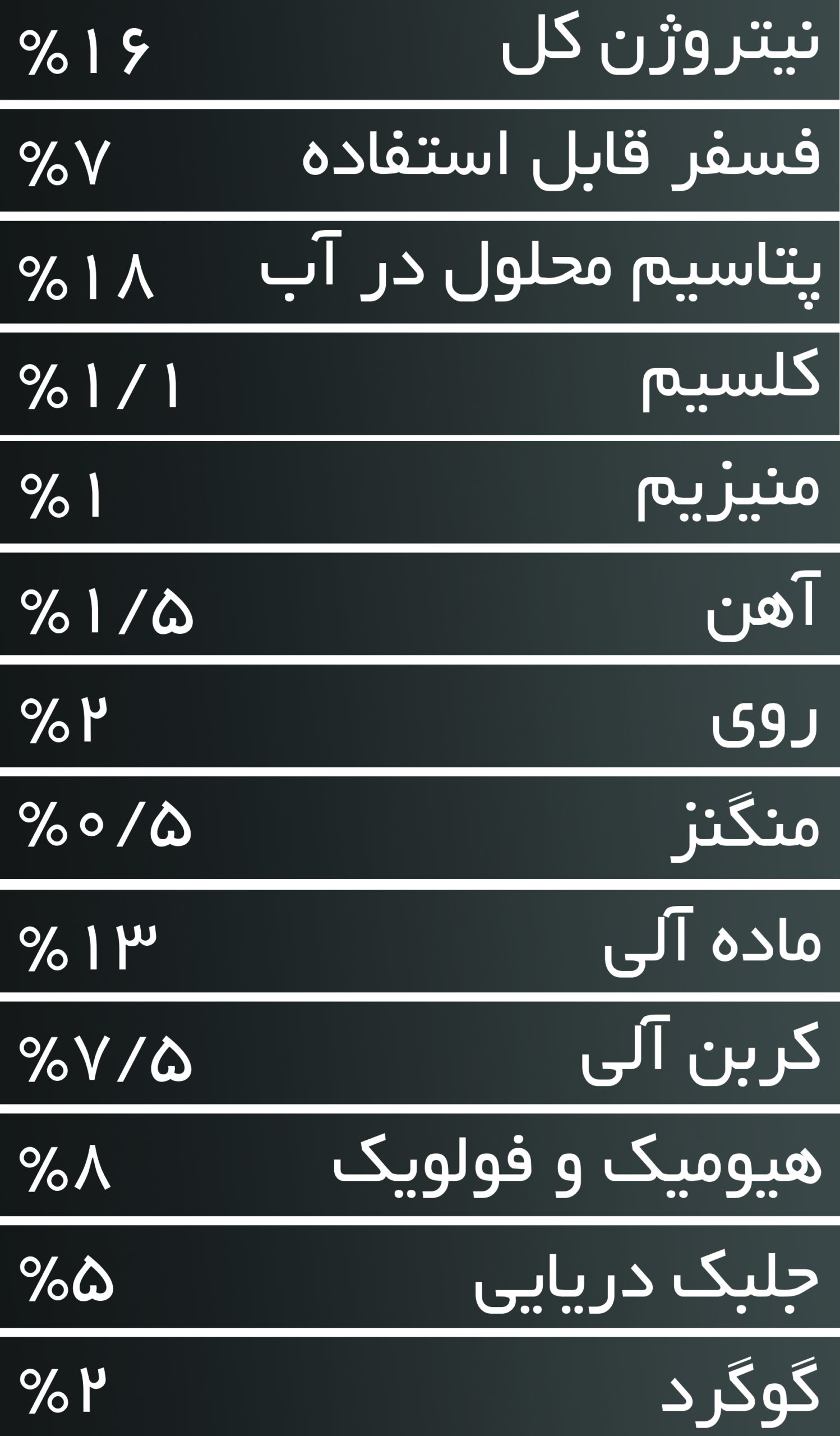 درصد بالای هیومیک و فولویک اسید در کنار NPK و کلات های ریز مغذی با اضافه شدن منیزیم و جلبک دریایی با فرموله شدن دقیق بر اساس نیاز هر گیاه کودی بسیار کامل را پدید آورده است، که می تواند کلیه نیازهای آن گیاه را در فرم آب و آبیاری و محلول پاشی تامین کند.