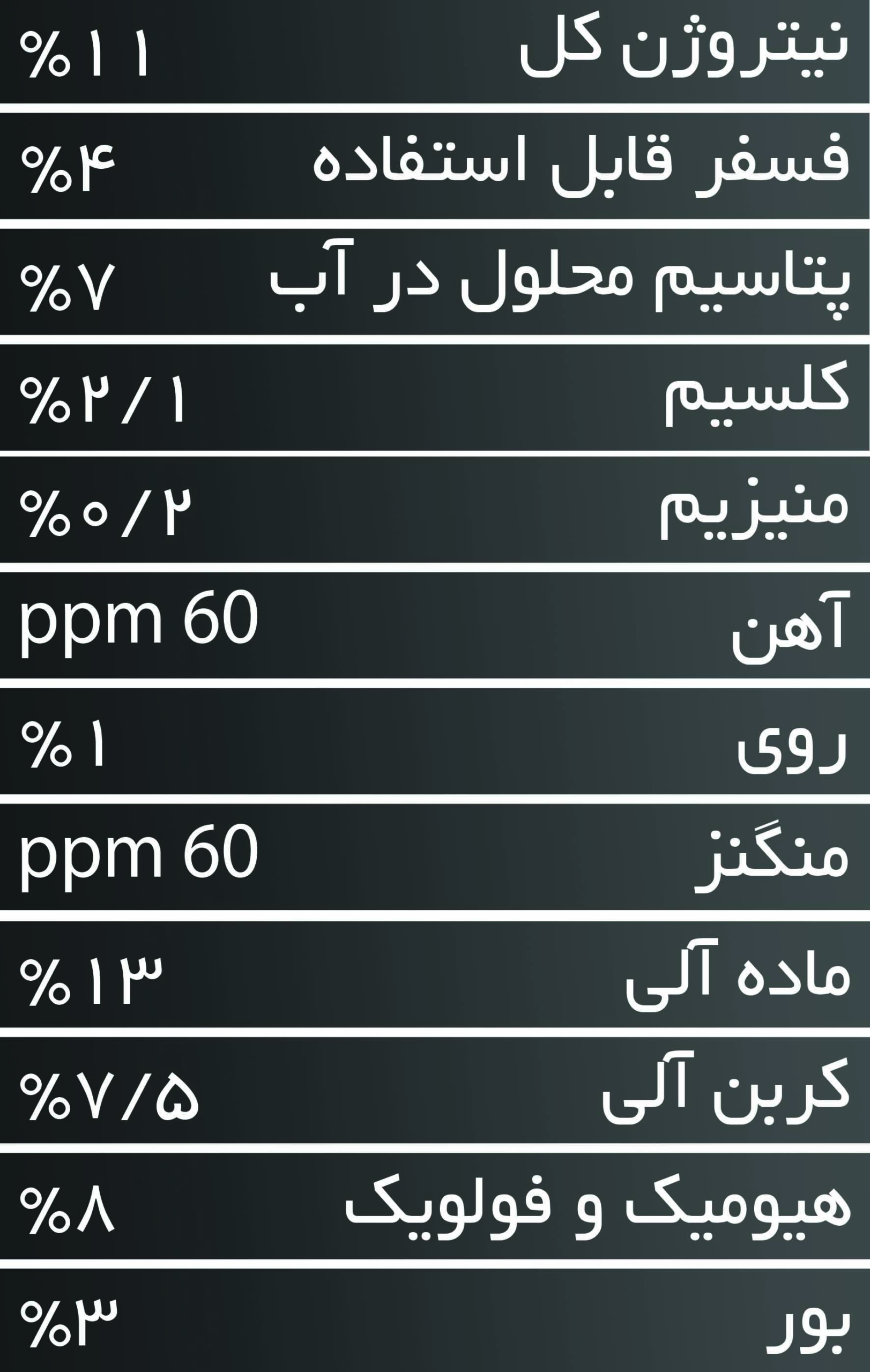 درصد بالای هیومیک و فولویک اسید در کنار NPK و کلات های ریز مغذی با اضافه شدن بور با فرموله شدن دقیق بر اساس نیاز هر گیاه کودی بسیار کامل را پدید آورده است، که می تواند کلیه نیازهای آن گیاه را در فرم آب و آبیاری و محلول پاشی تامین کند.