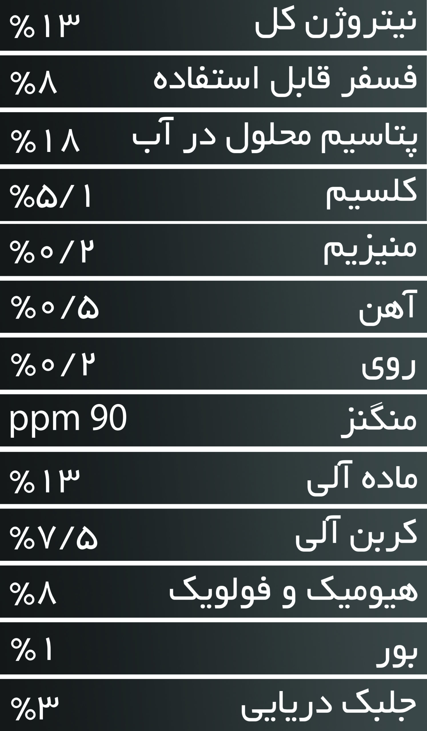 درصد بالای هیومیک و فولویک اسید در کنار NPK و کلات های ریز مغذی با اضافه شدن آمینو اسیدها و جلبک دریایی با فرموله شدن دقیق بر اساس نیاز هر گیاه کودی بسیار کامل را پدید آورده است، که می تواند کلیه نیازهای آن گیاه را در فرم آب و آبیاری و محلول پاشی تامین کند.