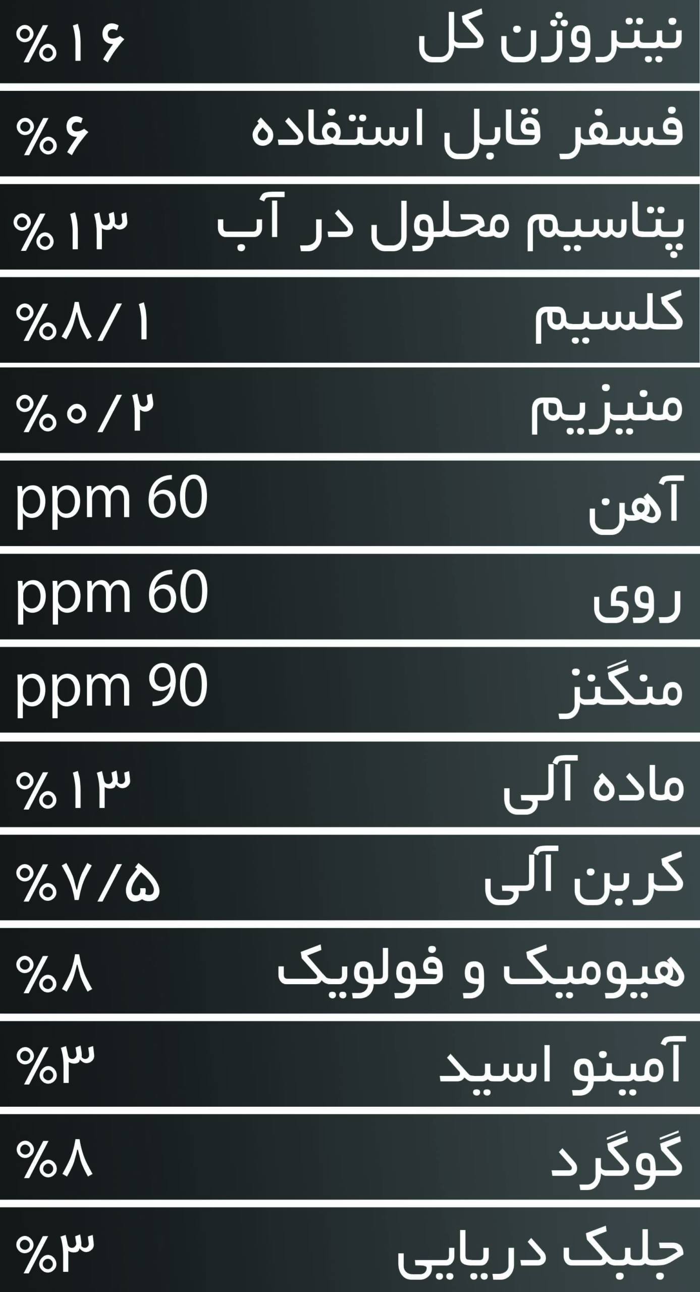 درصد بالای هیومیک و فولویک اسید در کنار NPK و کلات های ریز مغذی با اضافه شدن آمینو اسیدها و جلبک دریایی با فرموله شدن دقیق بر اساس نیاز هر گیاه کودی بسیار کامل را پدید آورده است، که می تواند کلیه نیازهای آن گیاه را در فرم آب و آبیاری و محلول پاشی تامین کند.